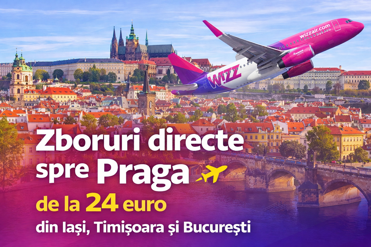 Wizz Air operează zboruri directe din România către numeroase destinații europene, cu plecări regulate din București, Iași și Timișoa